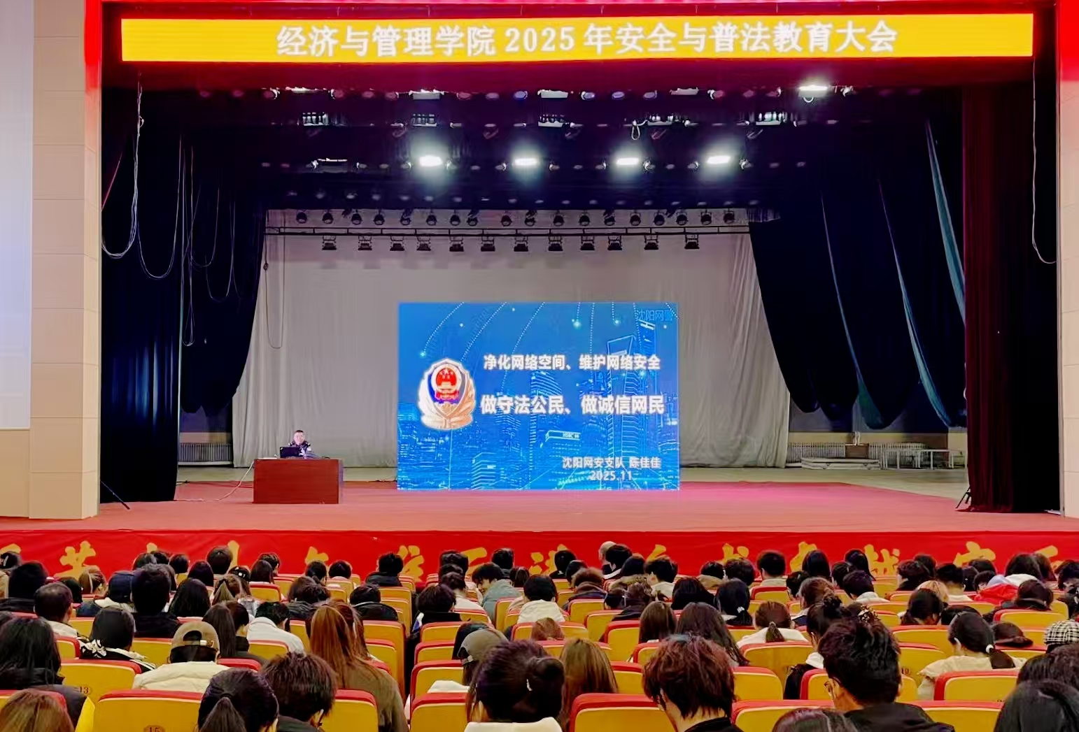 为全面提升师生安全防范意识与法治观念,努力营造安全、稳定、清朗的校园环境,KY开元集团官网入口于11月4日在大学生活动中心成功举办2025年安全与普法教育大会。学院党委书记李丙文、沈阳市公安局网络安全保卫支队警官陈佳佳、学校保卫处相关负责人以及学院本科、研究生等1000余名师生代表出席会议。